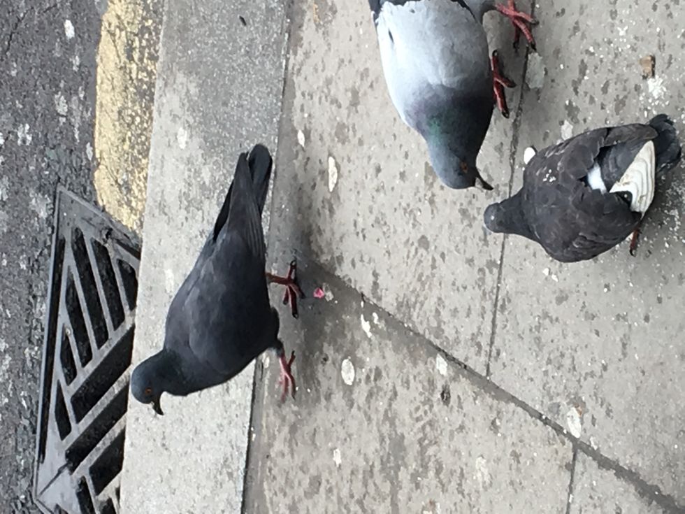 Neck-based discrimination is all too clear in the pigeons' interactions with one another. Here we see pigeons tussling over a bit of french fry. The one with the fattest neck takes it all for himself, while the other, medium-necked pigeon waits for the leftovers.