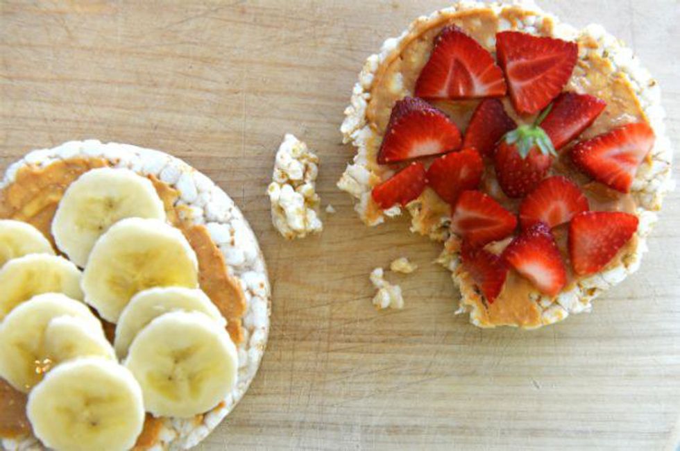 Rice cakes are a perfect light snack, however, topping it with peanut butter and banana and strawberry slices makes it a perfect study snack.