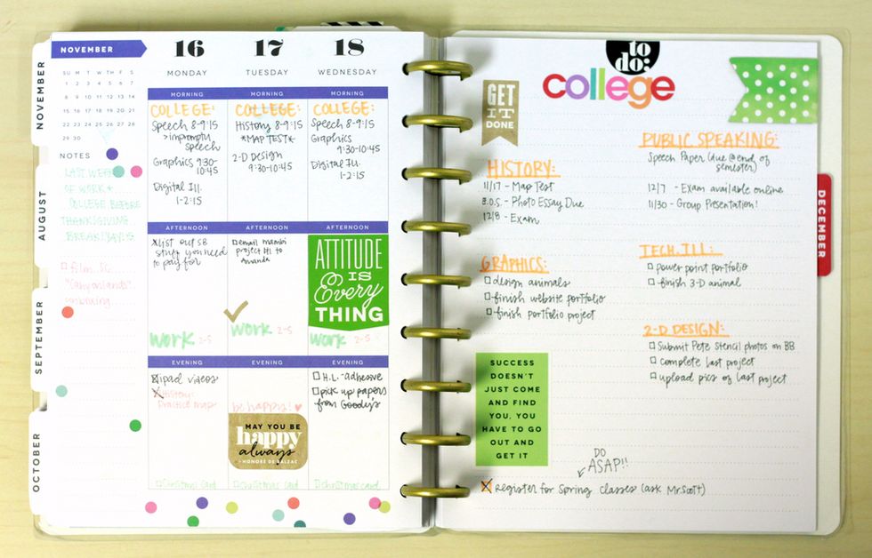 I didn't need to actually write things down in high school because my schedule was very predetermined, but in college with all that freedom it really helps to have everything you need written out. Remember that everyone gets the same 24 hours in a day, and you need to use yours as beneficially as possible.