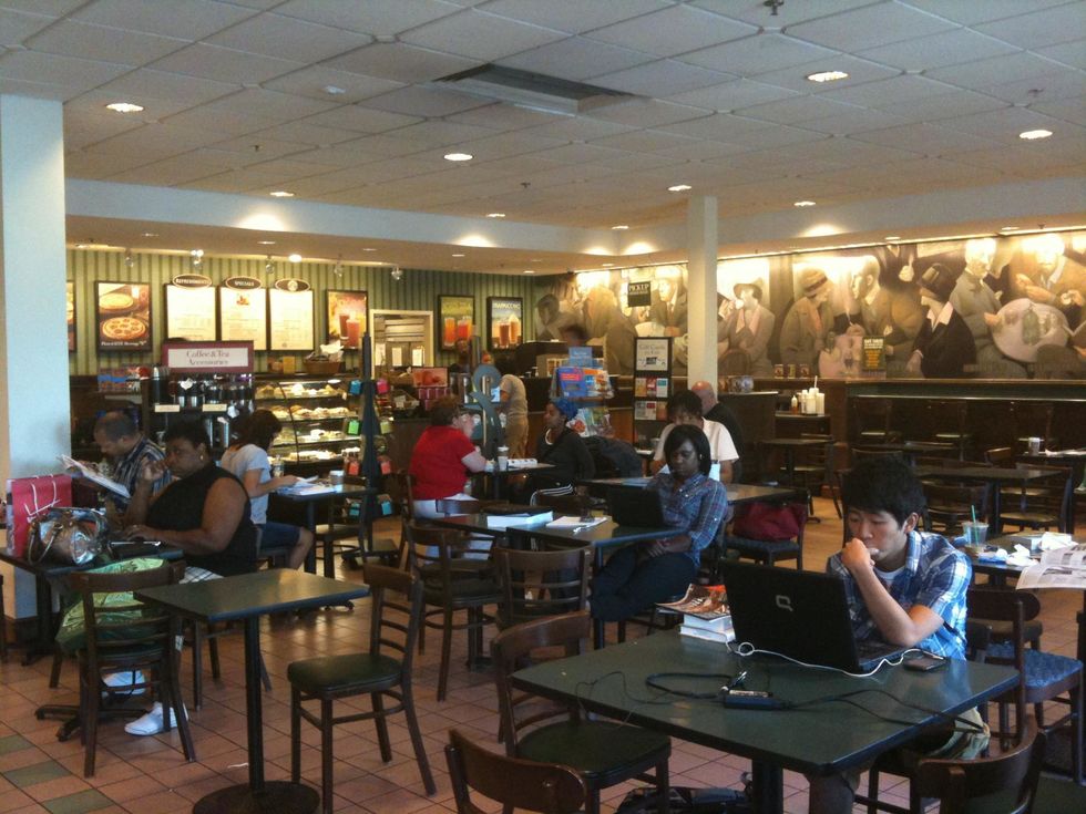 A bookstore may not sound exciting, but you'd be surprised at how many people go into one, sit by the cafe, and read and study. It's even a plus, if you're looking for a new book.