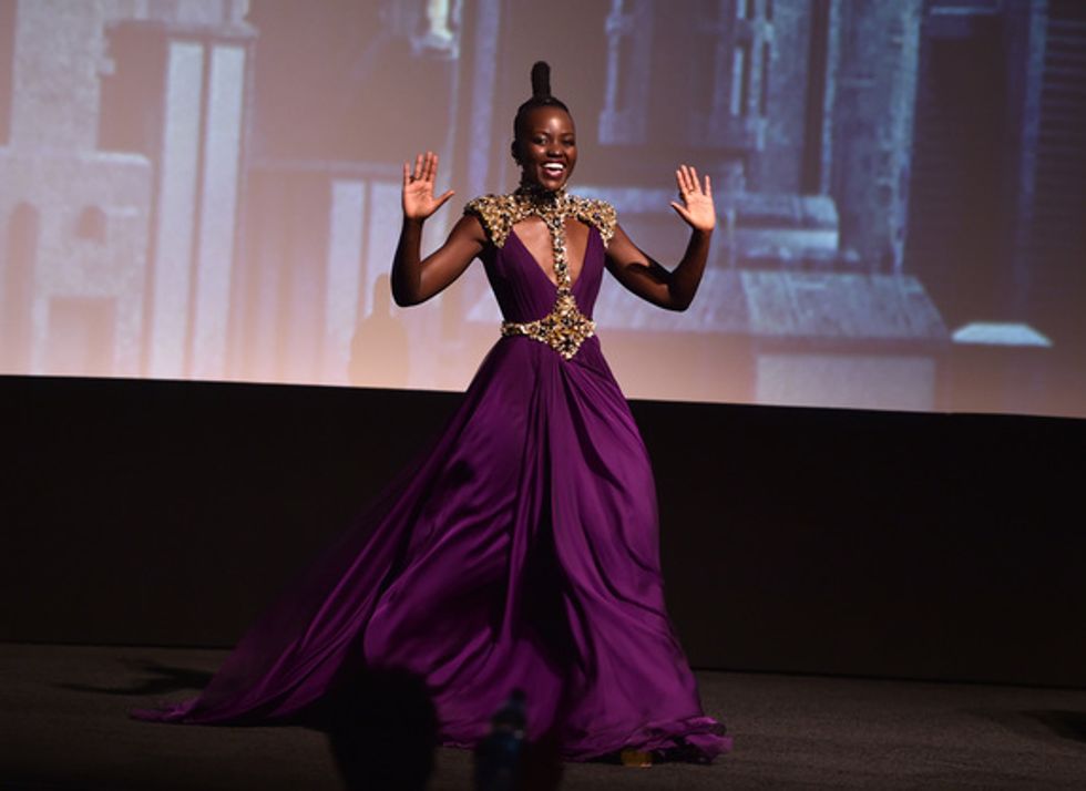 Actress Lupita Nyong'o looked absolutely regal at the Los Angeles premiere of the film. Her jewel-toned plunging gown, with gold and black jeweled details, was stunning and truly inspired by royalty. The gown is a Custom Atelier Versace deep purple chiffon gown, with a long train and an open back. She topped off the look with bold, gold accessories, winged liner, and dark lipstick. Her skyscraping updo adds a bit of risk to the whole look and really took the level of slay to the next level.