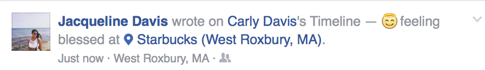 "Feeling blessed at Starbucks." It is absolutely not necessary to check-in everywhere you go. How do people even have the time to check-in to every location they're at? We do not care that you're feeling blessed while waiting in line at the Starbucks in Boston. Are you trying to recruit some friends to come wait in line with you without actually asking them?