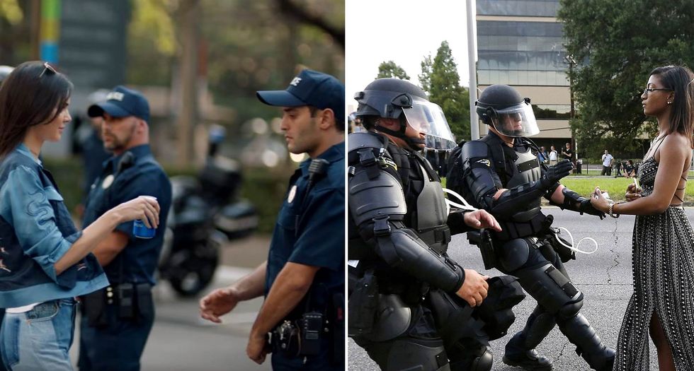 In case you’ve been living under a rock the past few weeks, I’ll give you a short recap of Pepsi’s latest advertisement. The star of this “short film” was none other than reality star/model Kendall Jenner. People are walking down the street, marching and carrying picket signs, just outside the door where Kendall is posing for some modeling shots. A man nods to her as if to say “come on” and she quickly takes off her wig, smears off her makeup, and joins the protest outside. On her way into the crowd, she picks up a shiny can of Pepsi and immediately proceeds to hand it to a police officer (in a way that was very reminiscent of the picture of Iesha L. Evans, pictured below, at a Baton Rouge protest last year) standing in front of the crowd. The cop shrugs to his colleague next to him, and the crowd goes wild. Every single problem anyone has ever had was suddenly solved via the cool, refreshing taste of Pepsi. In case you don’t quite understand why everyone was so up in arms over this advertisement, SNL did us all a favor and parodied the commercial.
