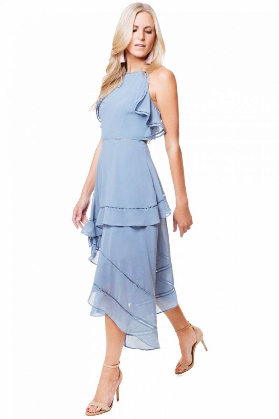 Keepsake The LabelI normally don't go for dresses that fall mid-calf but this dress is just too pretty to miss a party this fall. Flowy and effeminate, this showstopper features small cutouts that accentuate the layered depth of the design. The light blue has a somewhat grey undertone, perfectly understated to transition your color scheme from summer to fall. So many up and coming trends are built-in to this style and all you have to do is find a pair of pumps to complete the look.