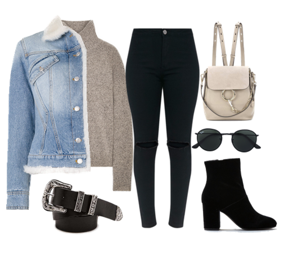 The neutral tones of the outfit overall gives a central focus to the shearling denim jacket. The western belt brings some edge to the calming color of the turtleneck and backpack. It's easy to find similar pieces in your own closet, as these are essential items for any season.