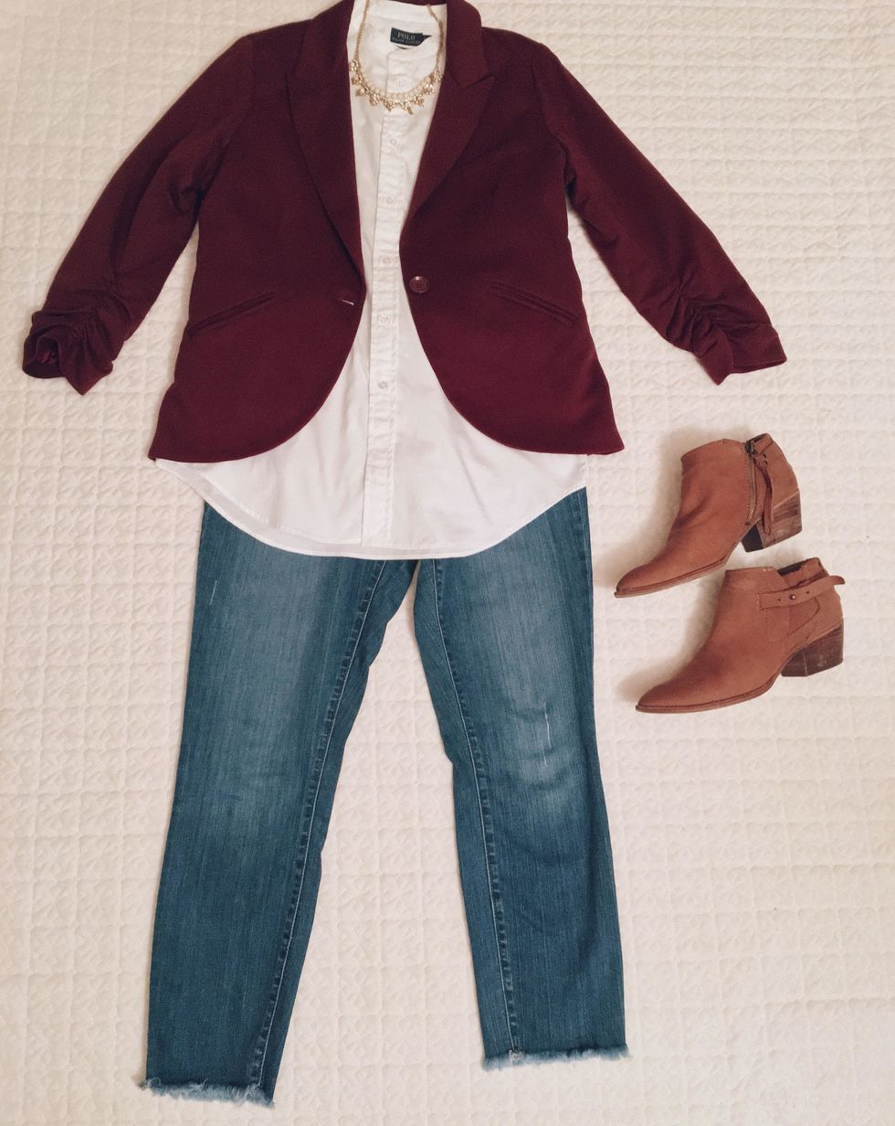 Those boyfriend jeans are not just for late night scrap-booking. Spice them up with a fitted blazer, classic button-up, and heels.