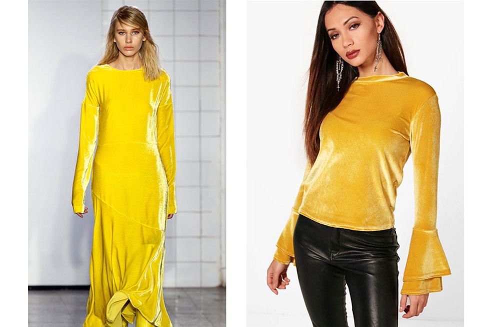 ON THE RIGHT: Petite Chelsea Ruffly Sleeve Velvet Top; $12.50 @ Boohoo.com