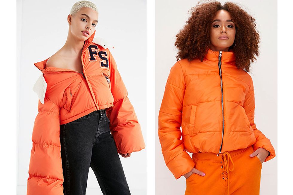 ON THE RIGHT: Orange High Shine Cropped Puffer Jacket $45.00 @ prettylittlething.us