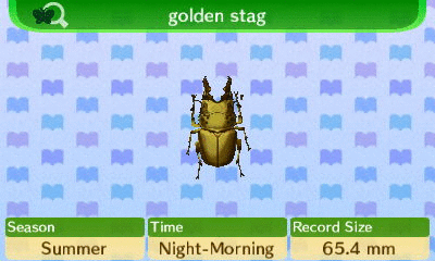 Yes, beetles. Beetles are a main source of wealth for a good ACNL player. Especially the Golden Stag, which, alone, is worth 12,000 Bells! Because they are worth so much, though, you have to sneak up on them very slowly; Golden Stags are the easiest bugs to scare away. Find out when the highest-selling beetles are out. For example, the Golden Stag, is out at night, and in the morning.