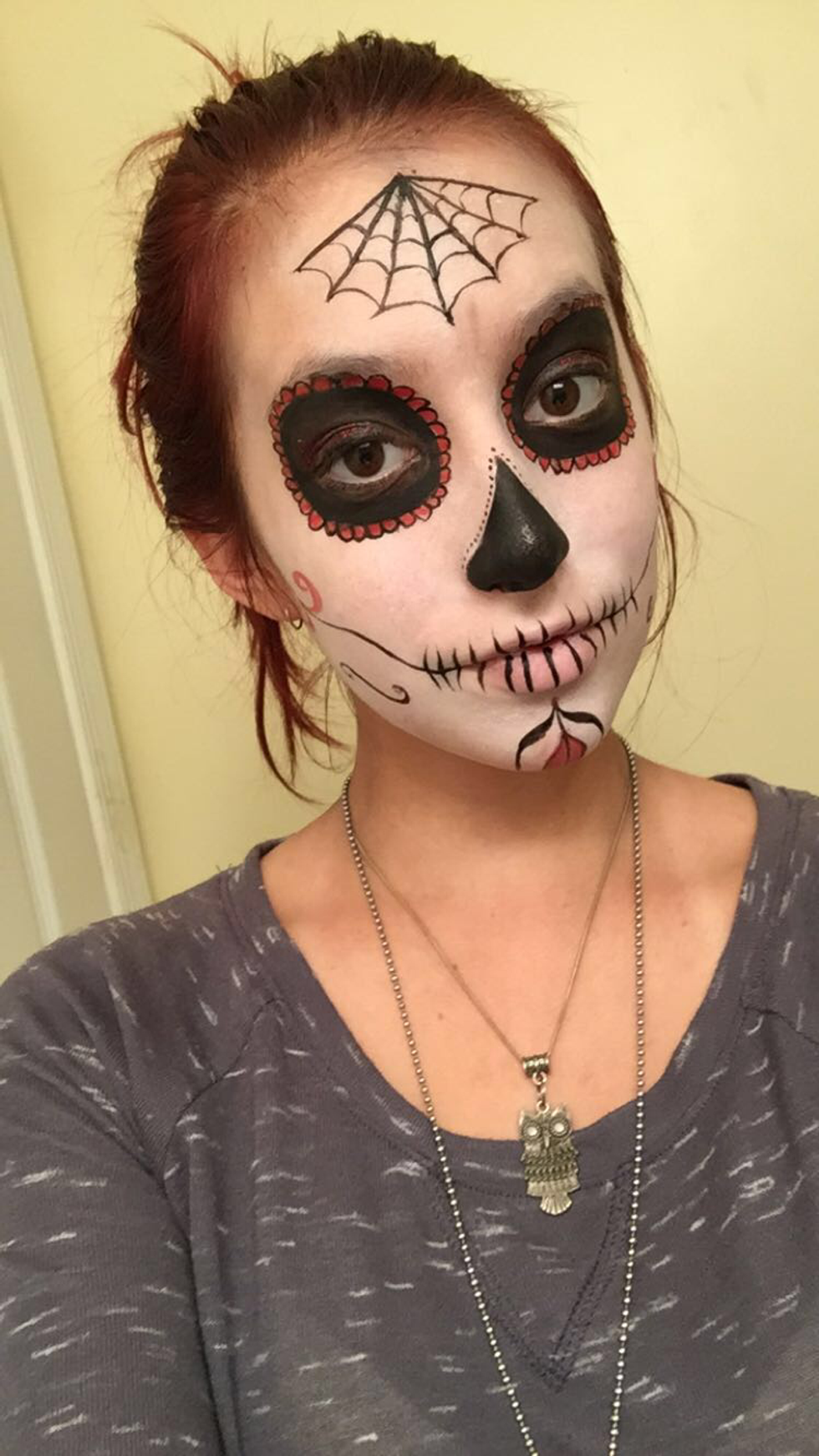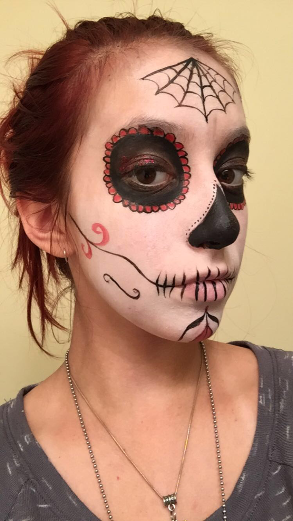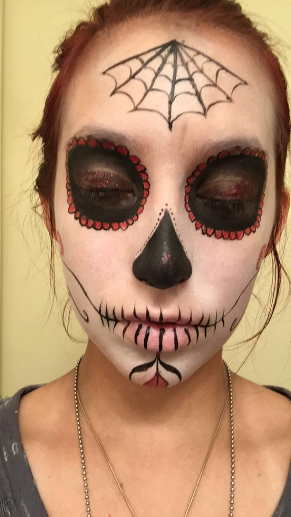 Materials: white, black, and any other color face paint you feel like adding (color is optional but most sugar skulls have at least one color), makeup brushes, any glitter makeup you want to add, and liquid eyeliner (the eyeliner is optional but I didn't have a clean brush that was thin enough for outlining on hand)