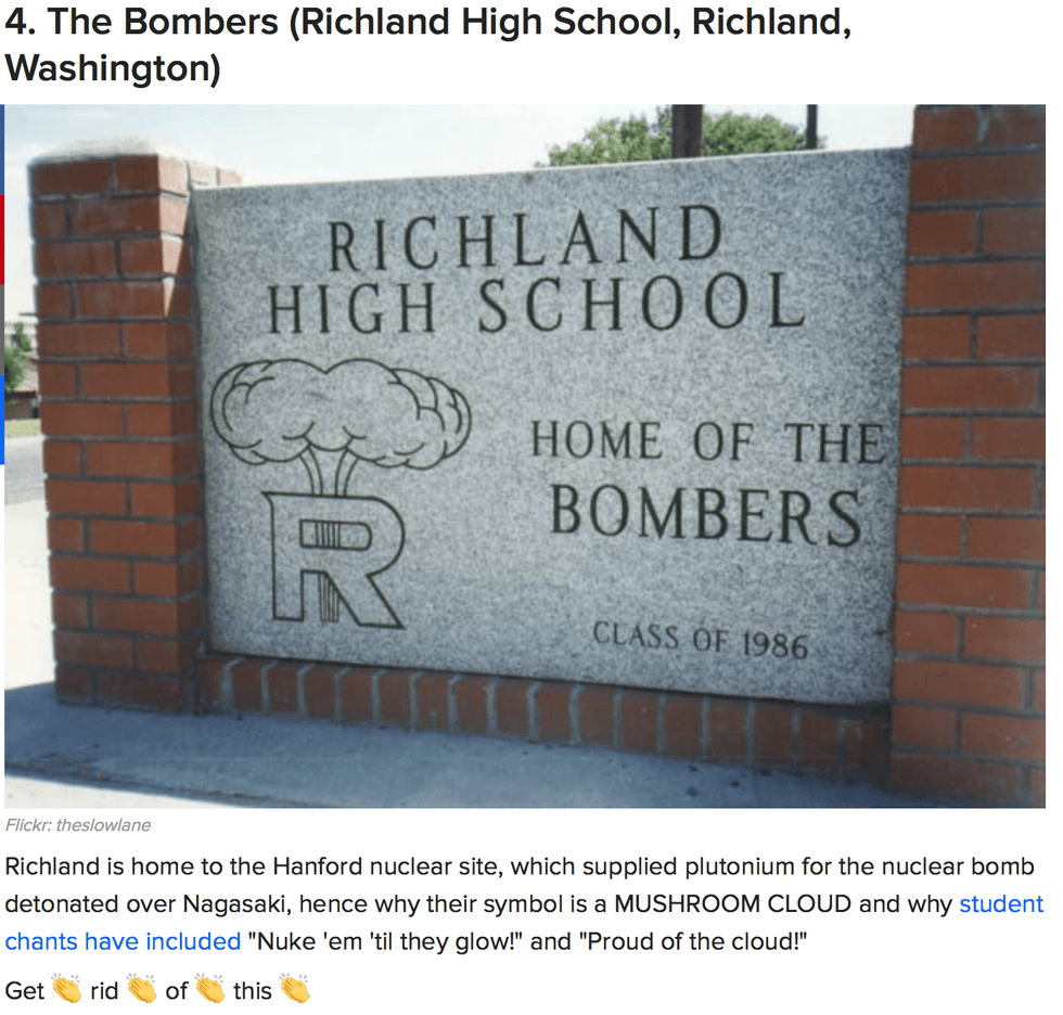 On May 1st, BuzzFeed released the article "25 Completely Bonkers High School Mascots That Actually Exist." Pretty high on the list was the controversial Richland High School Bombers.