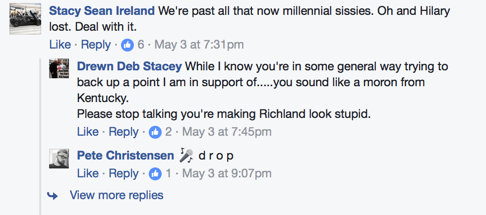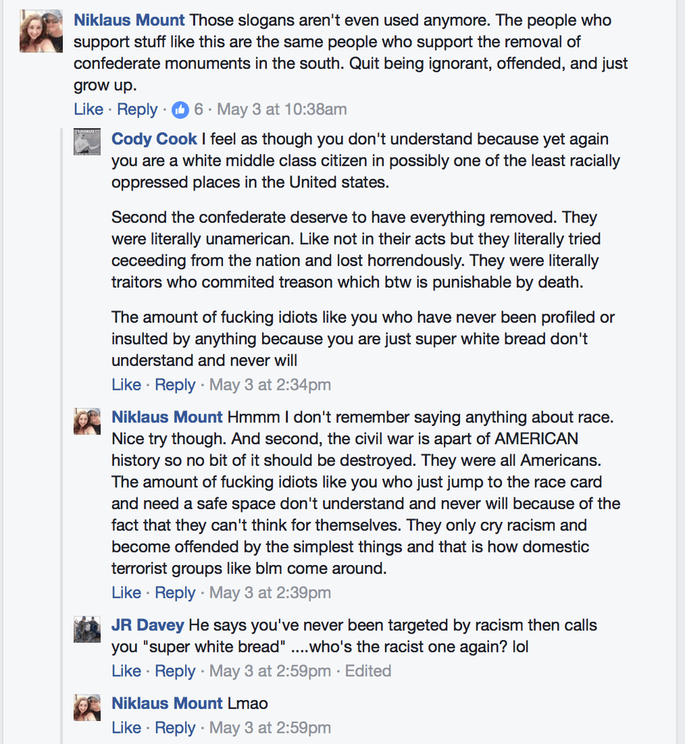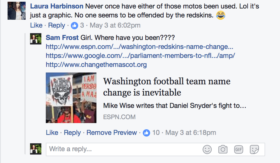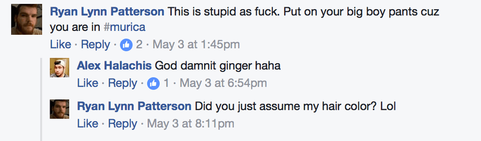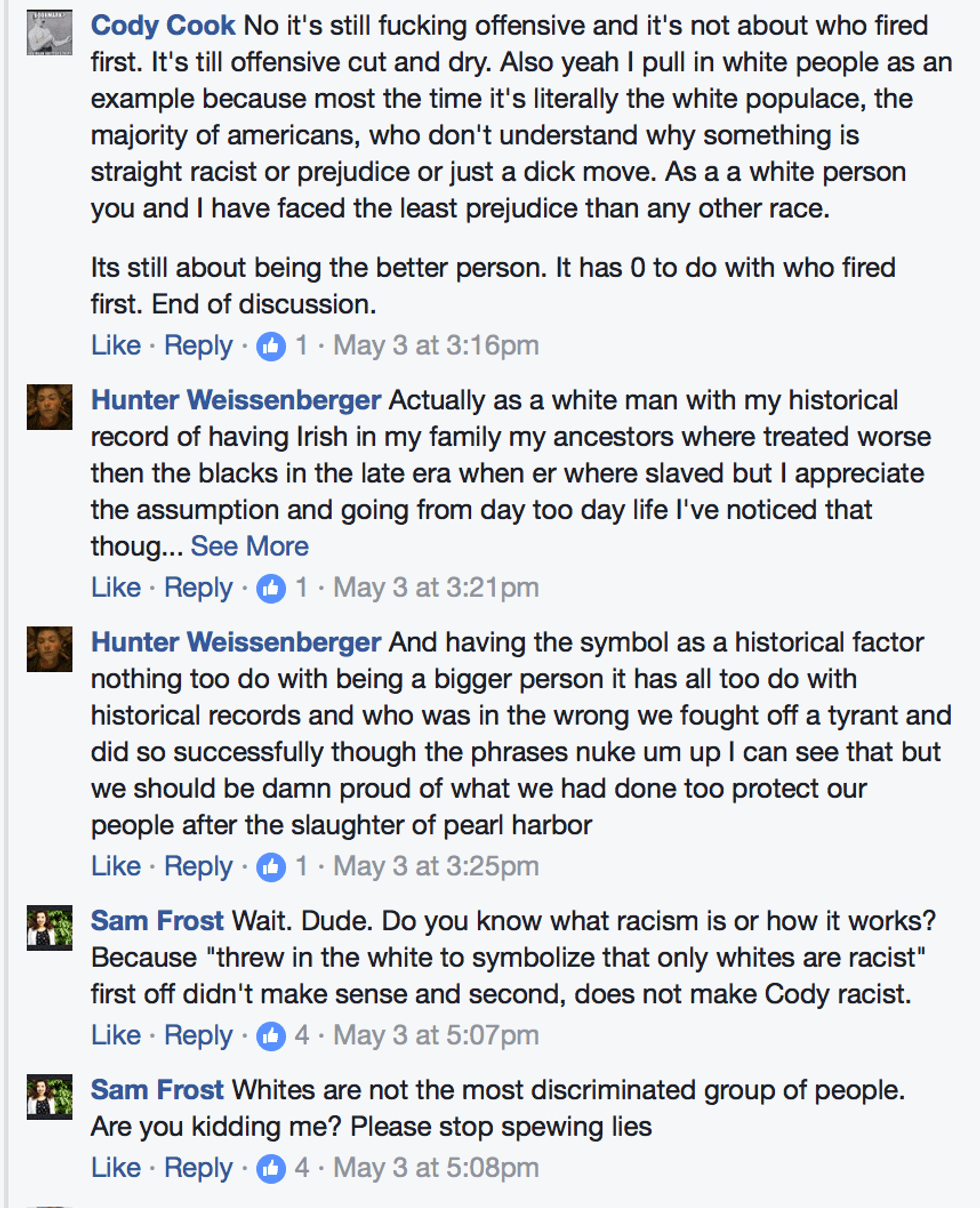 Personally, I am indifferent on the topic and see that both sides have legitimate points and reasoning. What I have a firm opinion on is to not be racist on other peoples' Facebook posts. Or don't be a racist in general, but, ya know, baby steps.