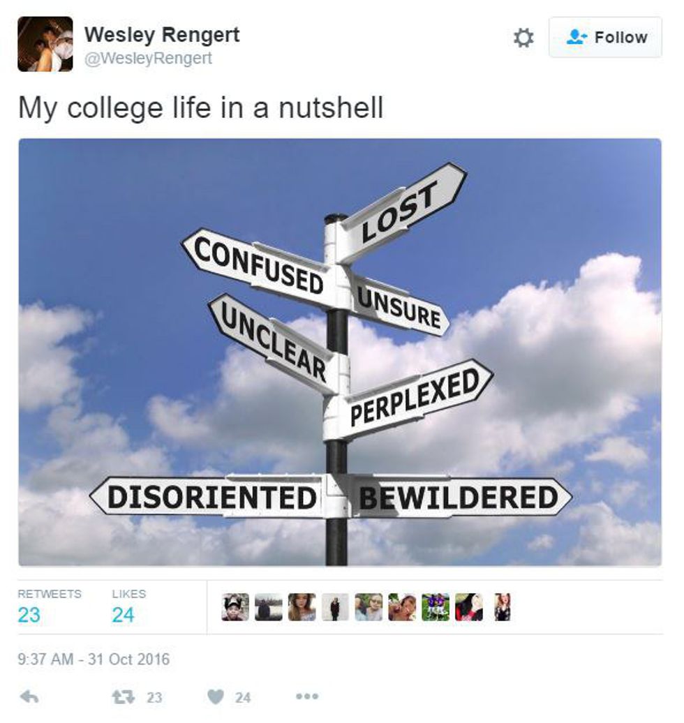 College makes you question your entire life. You wonder if you went to the right school, if you picked the right major, if you're wearing the right shirt today, if you said the right thing to that lady behind the cash register. Literally everything.