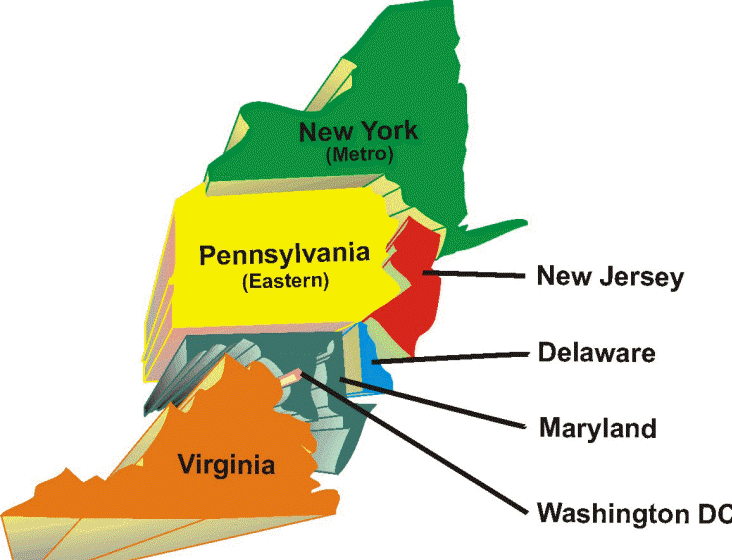 For our purposes, we are going to go as far North as New York, and as far South as Virginia, leaving us with boundaries of the following states: New York, Pennsylvania, New Jersey, Delaware, Maryland, Washington D.C., and Virginia. (Sorry West Virginia, I haven't visited you enough to know what's around.)