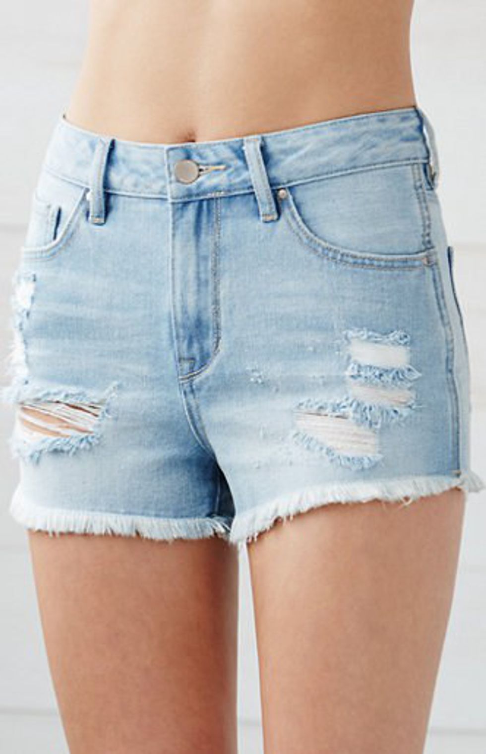 Above: Bullhead Denim Co. Blue Ripped High Rise Cutoff Denim Shorts, $39.95 (PacSun)