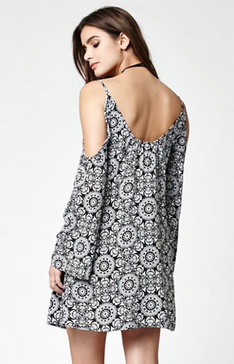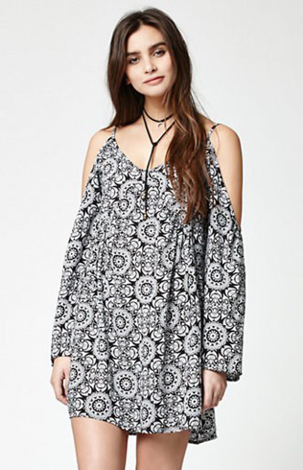 Above: LA Hearts Printed Bell Sleeve Cold Shoulder Dress, $36.95 (PacSun)
