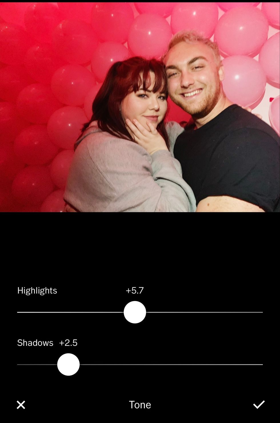 Then, I work with tone. Since this photo was taken with flash, a lot of highlights are on our faces. I want to make our skin tones look more even, so I took away a lot of highlights and took away some shadows as well. Increasing shadows on this tab can make a photo look more "faded" without actually taking away the integrity of the photo.