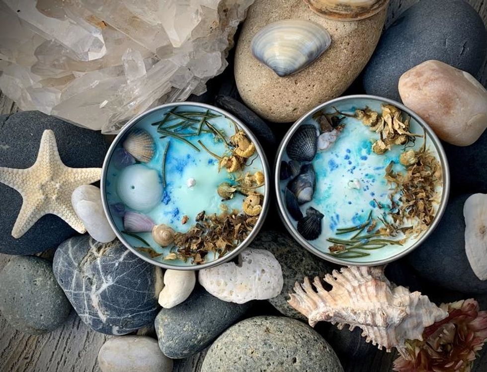 These lovely hand poured soy candles from Mystical Ritual on Etsy smell like the ocean and are full of shells, crystals, and dried plants.
