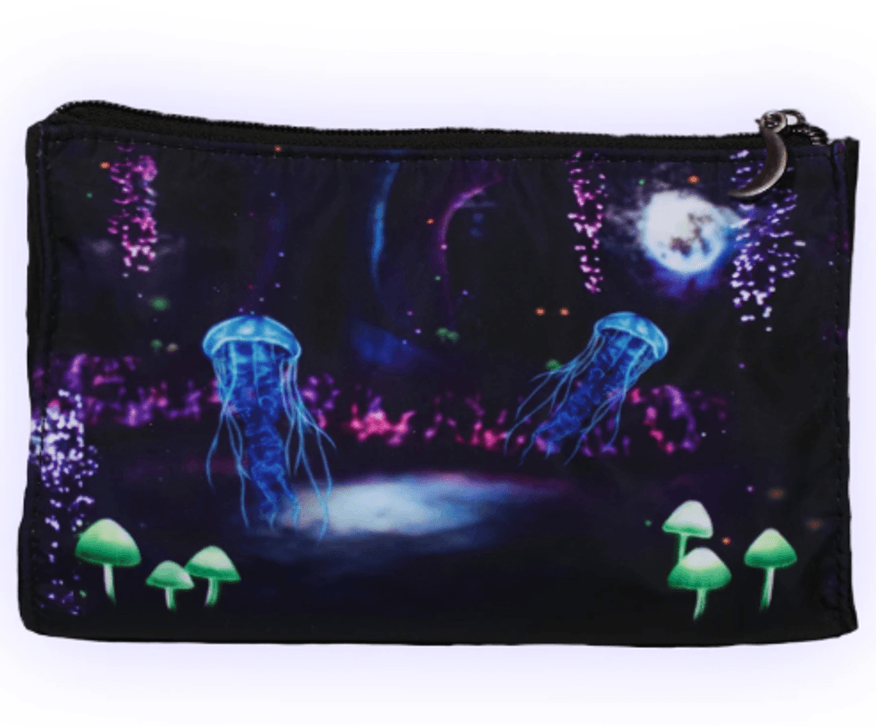 This bag features a jellyfish design and an adorable crescent moon zipper charm. Perfect for your makeup, sunscreen, or the goodies that you need by the sea.