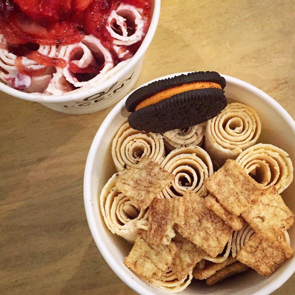 Ice cream mixed in front of you on -15 degree metal plates and then scraped off into rolls. It has a unique texture that is both icy and smooth. Mix it up with different add-ins to make each trip here unique.