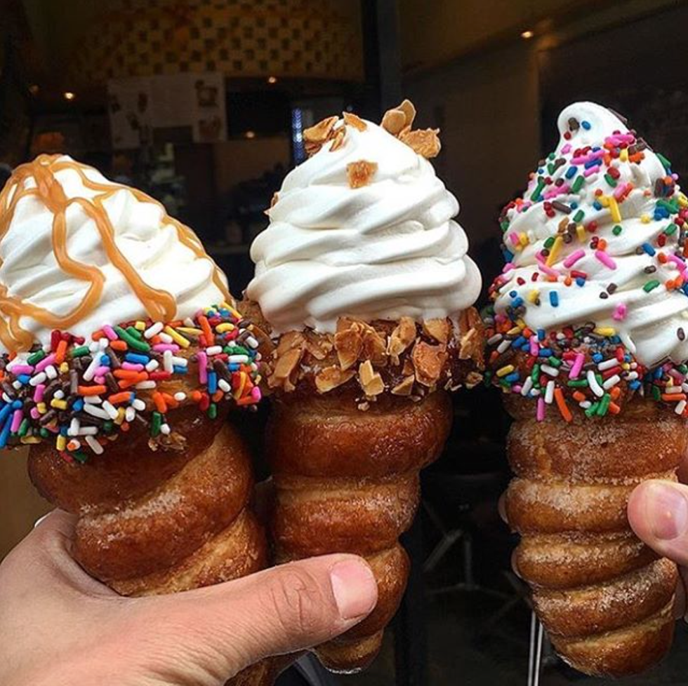 This place has become known for their churro ice cream cones. Not only is the cone a fresh, homemade cinnamon churro, but the ice cream and toppings are delicious as well. This cozy location has other winners like green tea crepe layer cake and other cookies, pies, and sundaes.