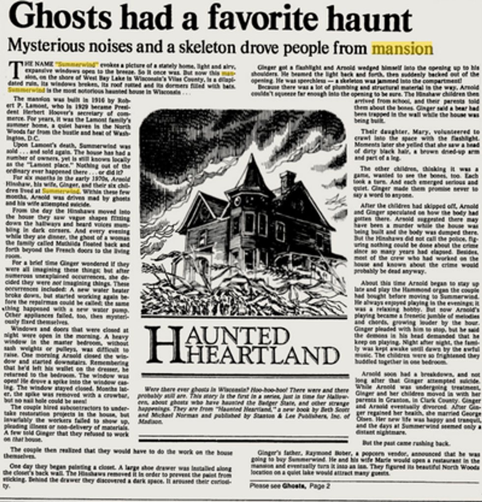 Rated as Wisconsin's most haunted house, Summerwind Mansion was destined to be haunted from the day it was built. It was built in 1916 by Robert Lamont in the shores of West Bay Lake, Wisconsin- the far northeast region of the state. The mansion is no longer standing, some of pieces and memories remain.