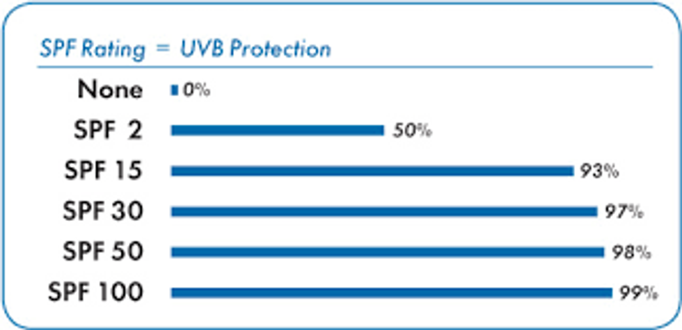 As you can see, an SPF 15 sunscreen theoretically blocks 93% of the damaging UV rays while SPF 30 blocks 97% and SPF 50 blocks 98% of the rays. Obviously, 100% cannot be blocked, so increasing to SPF 100 does not really do all that much more.