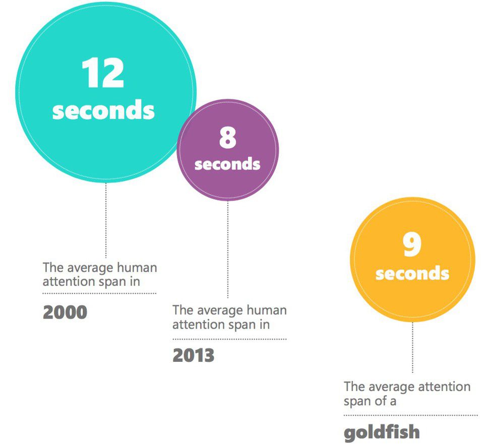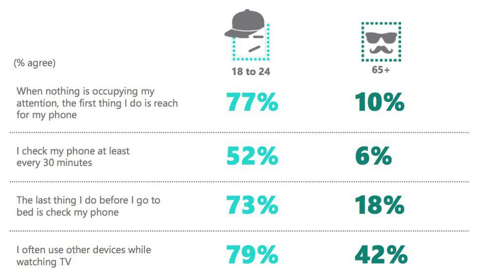 Microsoft did just that in 2013, with a study that compared surveys and EEG scans from 2000 and 2013 to determine the average time that a person could focus on a certain task. In 2000, it was 12 seconds; in 2013 it had dropped to 8 seconds (one second less than that of a goldfish). They also found that young people between 18 – 24 tend to be on their mobile devices about 60 percent more than people older than 65. Starting to think it might not be such a bad thing to unplug yourself from your phone every once and a while...
