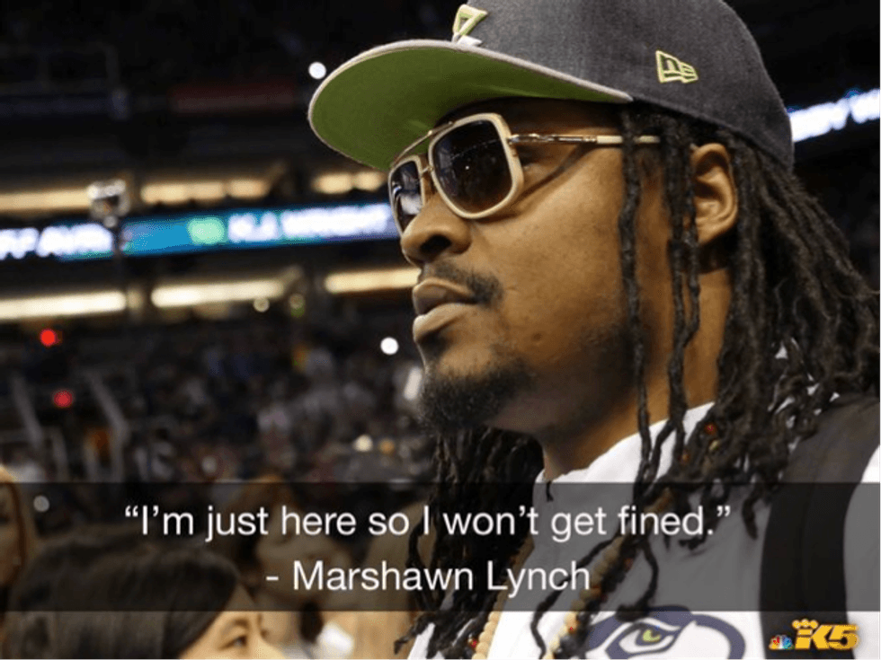Marshawn Lynch, Seahawks. Seattle's Marshawn Lynch represents the sister who doesn’t necessarily care to adhere to the ridiculous standard procedures enforced by executive officers. When noted of this sister’s repeated absence during workweek, the rest of the chapter can only speculate the enormous amount of fines she has stacked up.