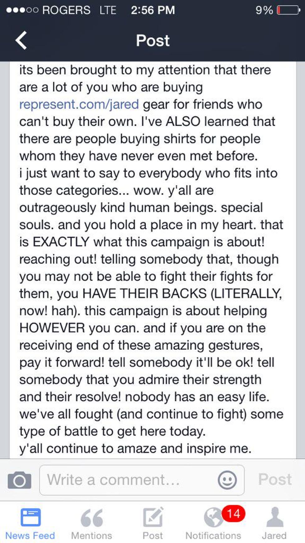 Six campaigns followed and thousands of shirts were sold, establishing The Pack Fund. This donor-advised fund gives grants to organizations such as To Write Love on Her Arms, Attitudes in Reverse, Random Acts, The Wounded Warrior Project, and St. Jude's. This campaign was crucial in the development of the SPNFamily Crisis Support Network, an initiative by Ackles and co-star Misha Collins. The network trains volunteers in mental health crisis support and pairs them with fans in need. This campaign's slogan was You Are Never Alone, and at the end of the campaign, over 10,000 shirts had been sold and 1,500 fans had volunteered.
