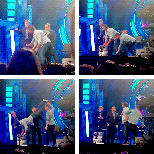 Misha was missing for a few minutes before he eventually dragged out a chair smaller than the rest as a comedic bit that "they planned in advance to mock the uncertain status of Castiel moving into season 13." Throughout the panel there was lots of playful teasing, as is common among the cast and crew, and plenty of laughs among everyone onstage.