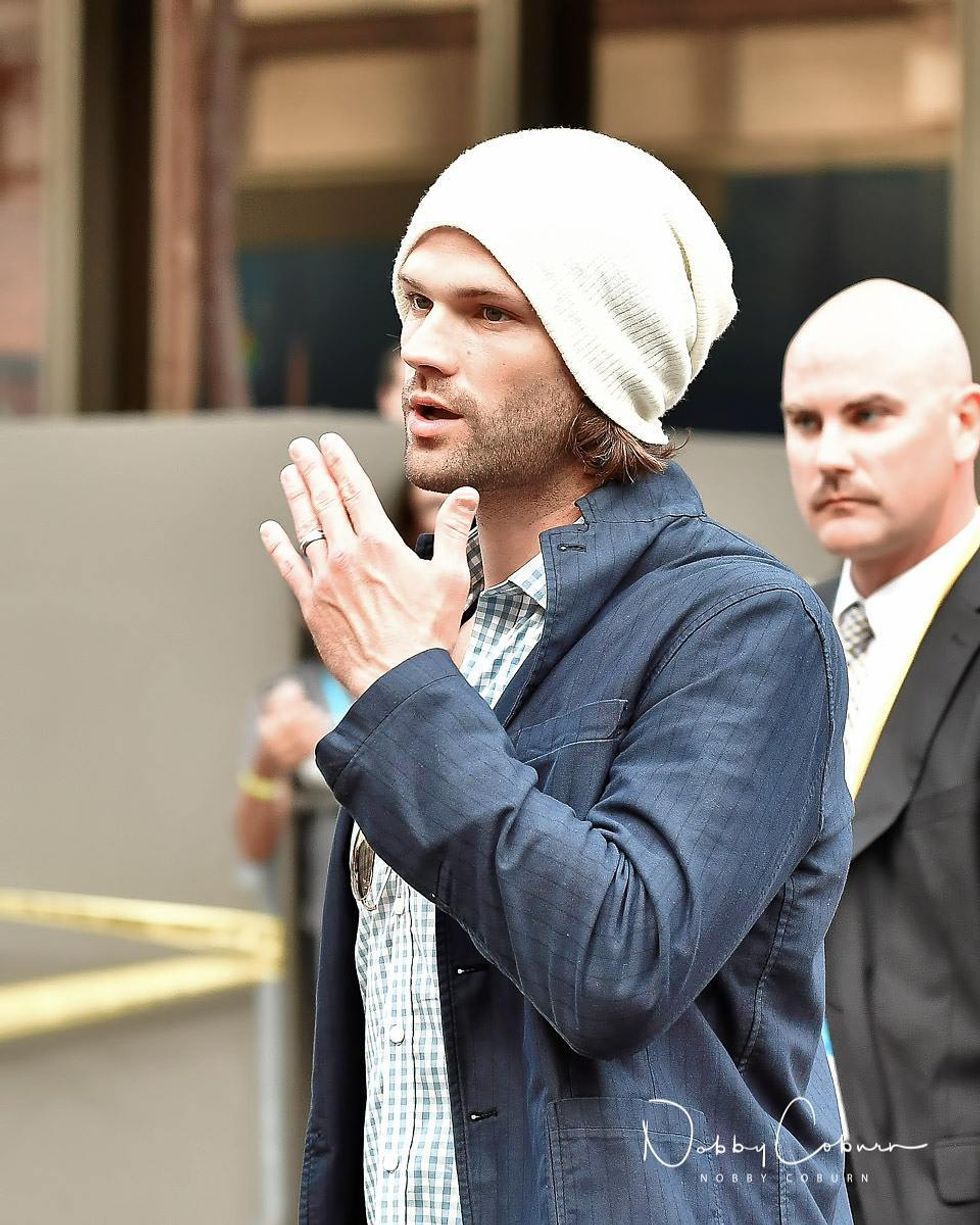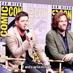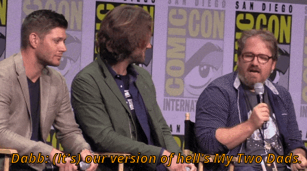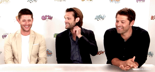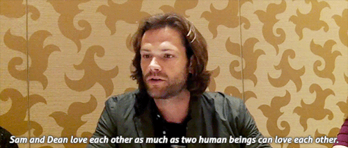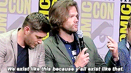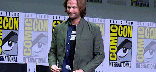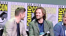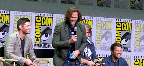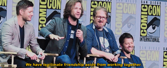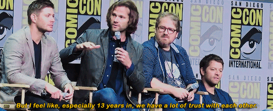 The cast talked about their connection with the characters: Misha told a story that Jensen shared during an interview on Friday about a dream he had of the show ending. In the dream, Sam died and Jared, Jensen and Misha all got choked up because the idea of Jensen as Dean losing Sam is painful even (especially) to them. (In an interview later in the day, Jared spoke about the day Jensen came to set and Jared noticed he was shook up and Jensen told him about the dream and about Dean losing Sam). Jared talked about the friendship the cast and crew have with one another, that as much as they tease each other (and the "short one at the end") they have a legit friendship and 13 years in have built a lot of trust with each other.