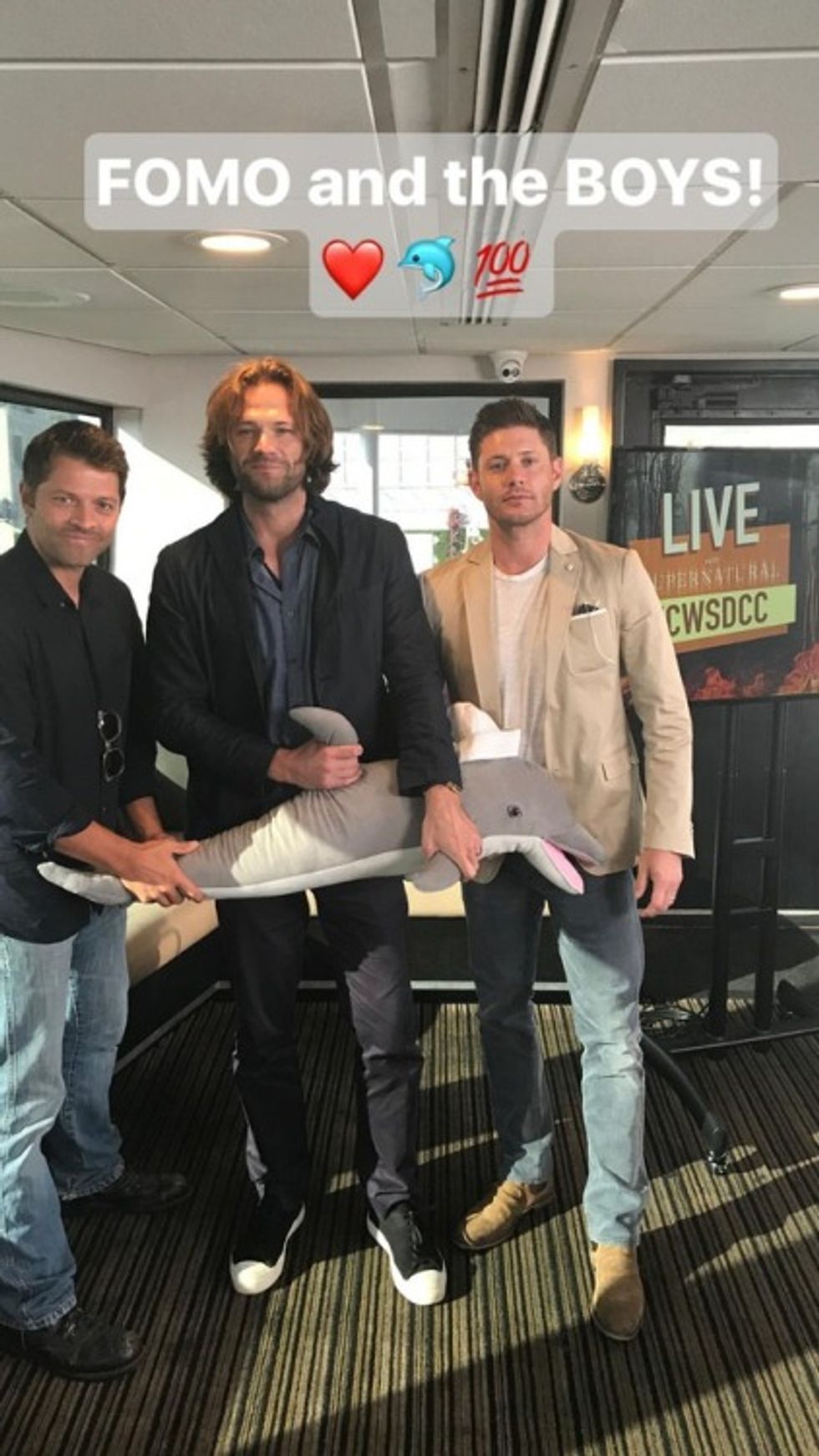First, Jared, Jensen and Misha Collins (Castiel) played a fun game answering questions about each other on the Warner Bros. (WB) boat live on the official "Supernatural" Facebook page:The three also got a picture with FOMO the Dolphin...