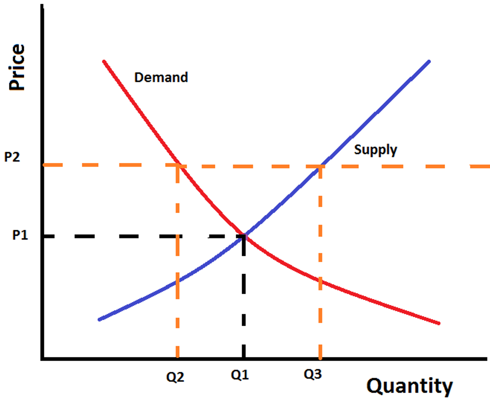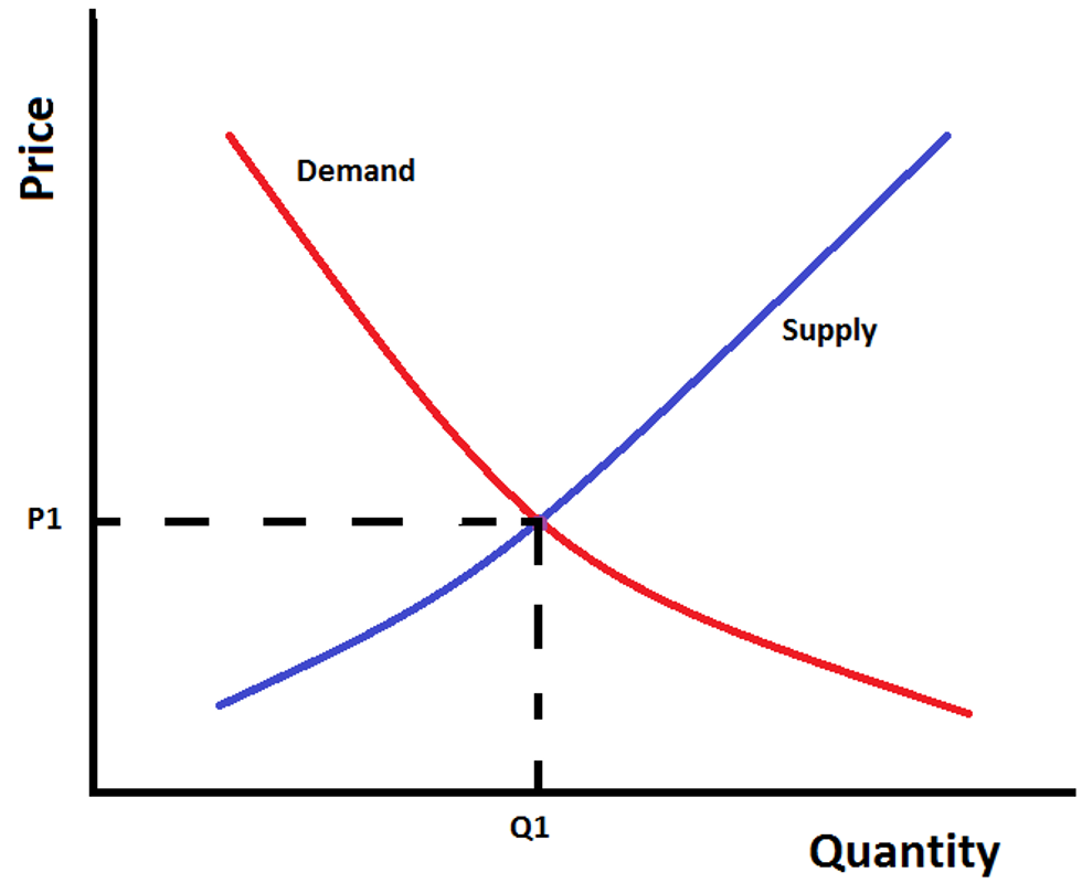 See where the lines intersect (Q1, P1)? That's called the equilibrium point. That's the point that the quantity (Q1) people are willing to buy is equal to the amount people are willing to sell and the price will remain semi-constant (P1) under certain set of circumstances - which we won't go into. If the price does go lower, the product will be bought up quickly and not everyone who wants the product at the price will be able to get it, so the price gets pushed up. If the price goes higher, the product will be in excess, because fewer people are willing to buy than sell, so the price will go down to encourage people to buy again.