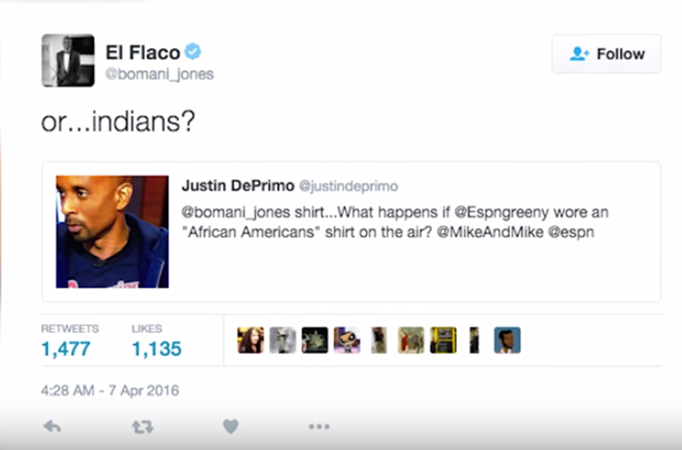 If you paused for a moment while glancing at the cover image, I’m glad. On Thursday of last week (April 7, 2016) ESPN sports journalist Bomani Jones became the talk of social media. He didn’t say anything outlandish or offensive, but he did wear a t-shirt. The shirt read “Caucasians” and showcased an image similar to the mascot of the Cleveland Indians baseball team. Of course some people weren’t too happy about this.