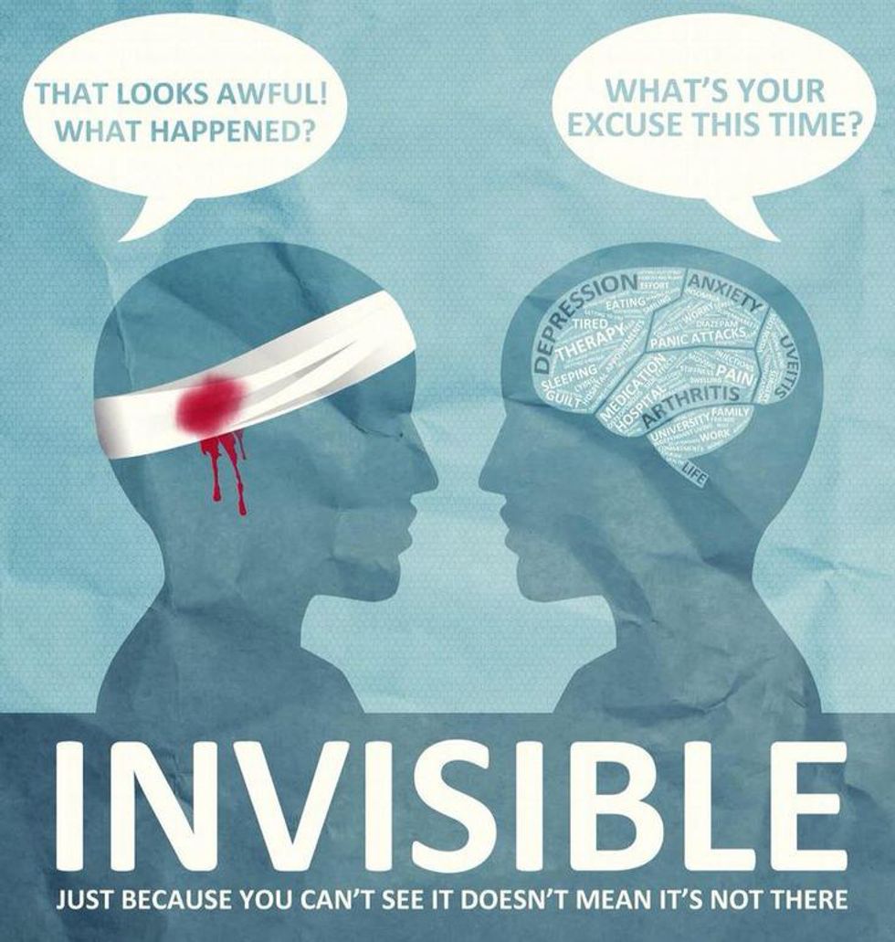 In order to make it easier to understand "invisible illnesses" as they are often called, I will describe them using physical ailments. This is strictly for clarity and is not in any way a statement on those diseases. Well intentioned people sometimes are unsure of how to approach the topic, so do not feel discouraged if you have made these mistakes. This is the perfect time to change how we have the conversation.
