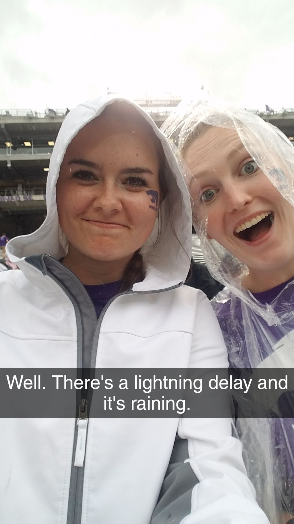 Weather and lightning can delay a football game for a LONG time and get REALLY boring. An 11:00 o'clock start time can go to 2:00 o'clock just from lightning being within 10 miles of the stadium. Whether you leave your seat or not, be ready to pass the time with some fun games that keep morals up. I, personally, have played "I'm Going to a K-State Game and I'm bringing..." the entire way through the alphabet. You could also play fun group games on your phone like Heads Up. Time can go by really slow or really fast, whether you watch the game or not you can still make memories with your friends.