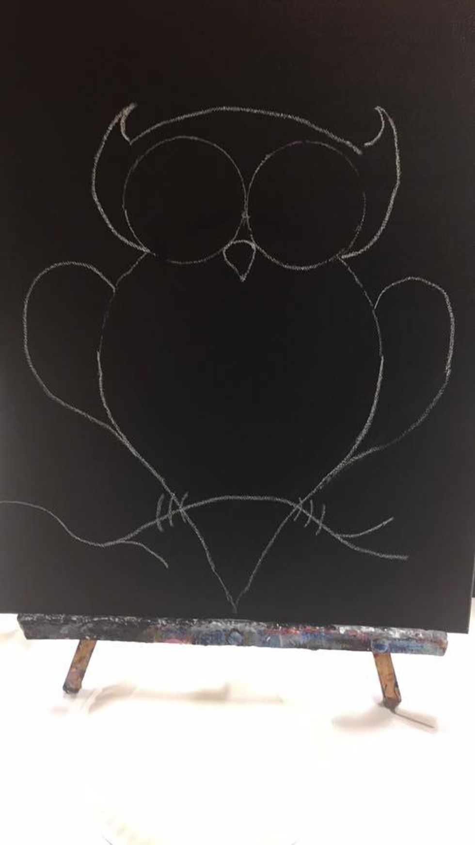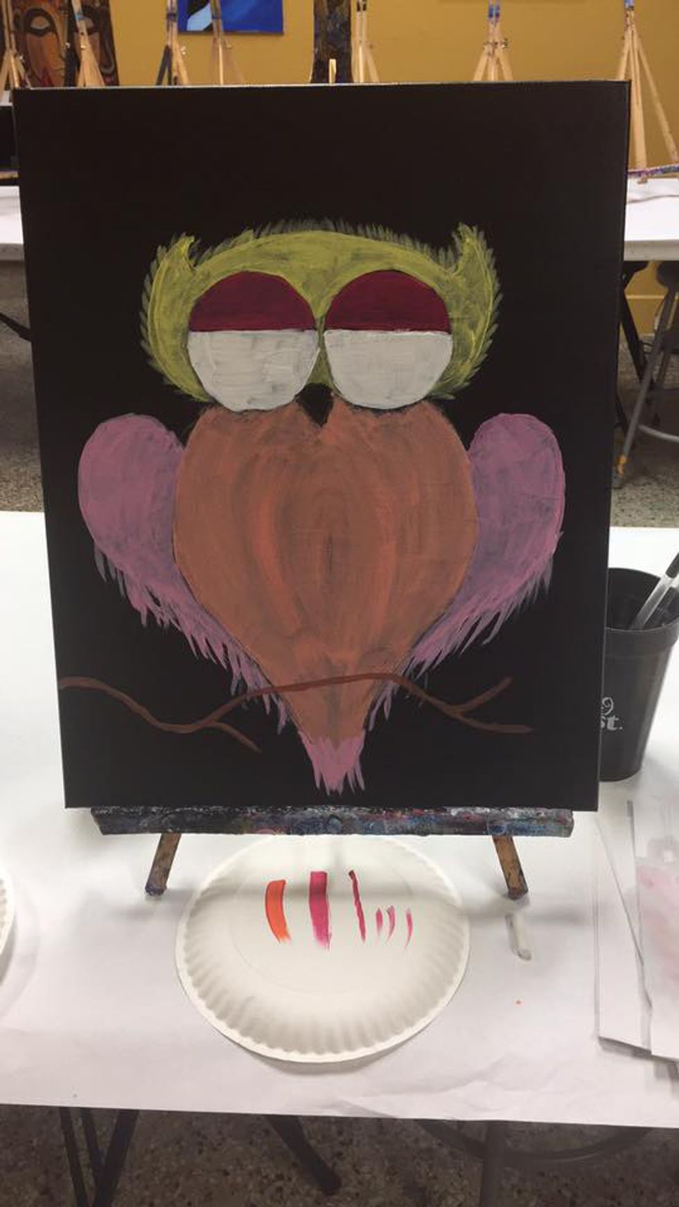We started by drawing our owl in chalk. This way we could erase any of the lines we didn’t like and could redo them. David then walked us through mixing our colors so that they’d show up best on our canvas. We did an initial background color to set the foundation for the rest of our paint. Filling in the shapes I had drawn seemed like a challenge in and of itself, but it only got harder from there. Next we had to add in feathers, branches, and eyes. At this point, my best friend was way ahead of me, but David kept coming over to help me through my struggles. He taught me the best brush strokes to use and how to blend colors until I got the one I wanted. If it weren’t for David, my owl would not have been finished.