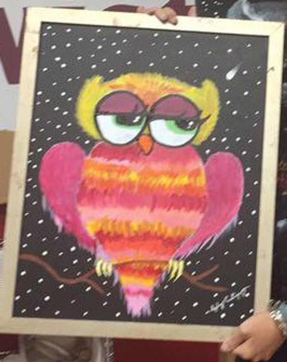 After my owl was complete, David showed us how to create a starry night background. At first I was just putting dots everywhere until I realized they needed to be clumped to look more like stars. Of course my best friend realized this from the start so hers looked amazing. I even added a shooting star and wished for my painting to come out decently. Lo and behold, I ended up with a painting that somewhat resembled an owl.