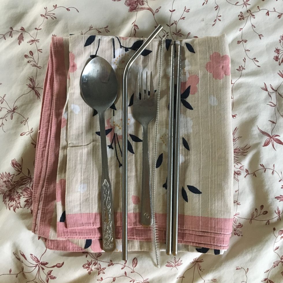 Since the place I get my food is packaged, I try my best to avoid plastic utensils. I carry a spoon, chopsticks, fork, and my own stainless steel straw in a Furoshiki (Japanese cloth used to wrap thing such as Bento Boxes).