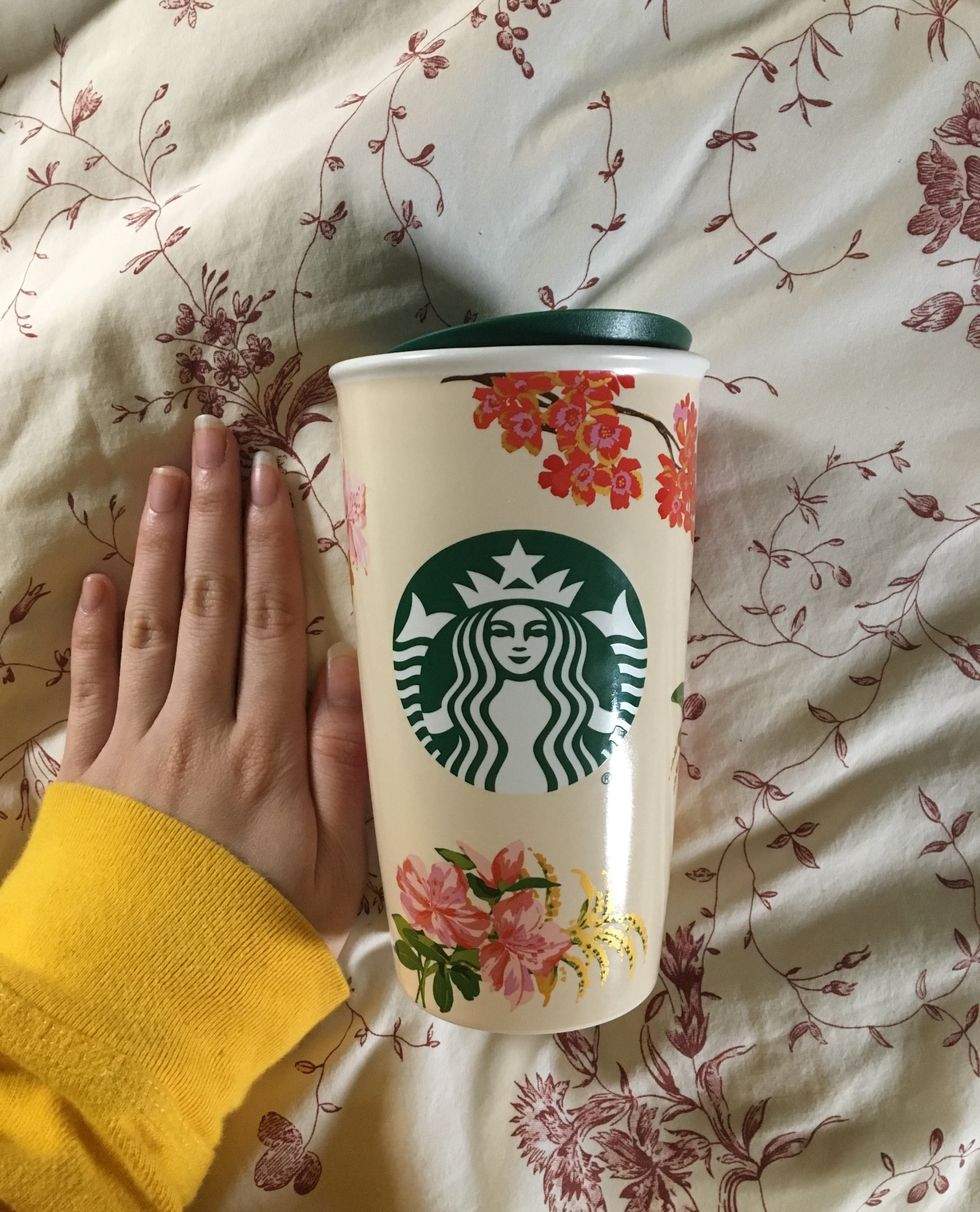 I head to the Starbucks occasionally here on my campus so I bring this reusable ceramic cup (super cute) that comes with a lid and ask to have my cups in there.