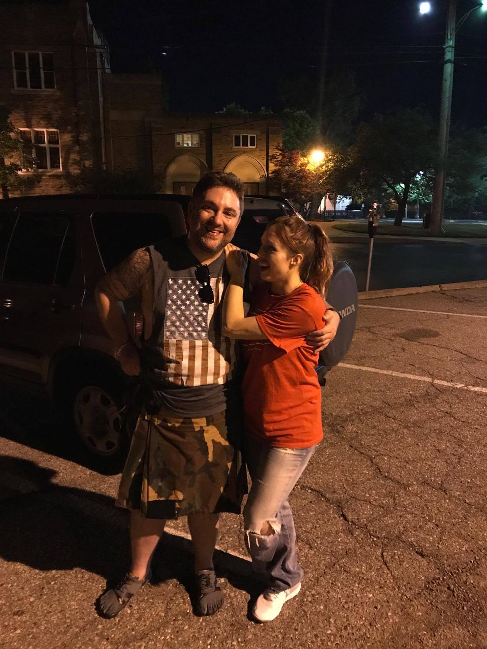 Above you see a friend and I in my self-dubbed "Pseudo-Scottish 'Murica" look, worn on the 4th of July, too. Comfortably worn at the Lansing Lugnuts 4th of July game, too. Following is a reflection of my experiences of wearing a kilt seven years ago, the 4th of July, and the Tuesday following the 4th.