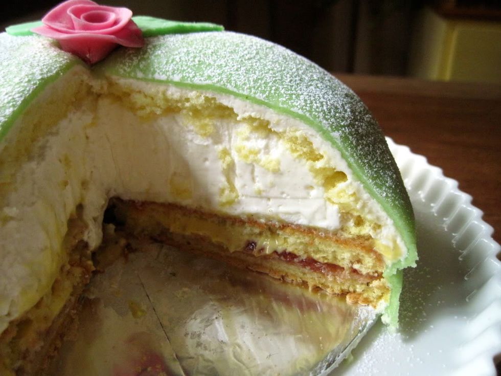 This cake is quite possibly my favorite food in the entire world. It has strawberry jam, just regular yellow cake/pound cake, a huge helping of whipped cream, and its covered in marzipan. It is so good I can't even put it into words.