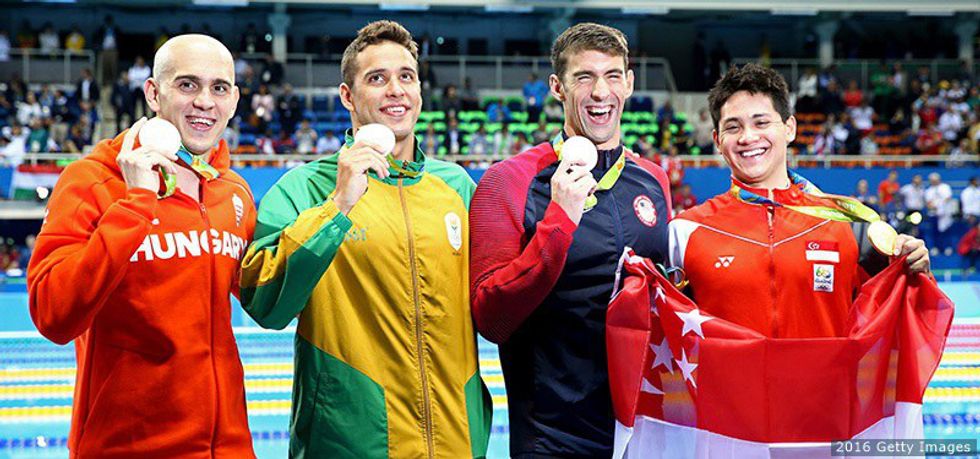This was the first three way tie in Olympic history, and according to this swimswam article, it was a perfect way for Phelps to finish his last individual event ever. Also, the four medalists looked hilariously cute laughing about the three way tie and Joseph Schooling winning the first ever gold medal for Singapore.