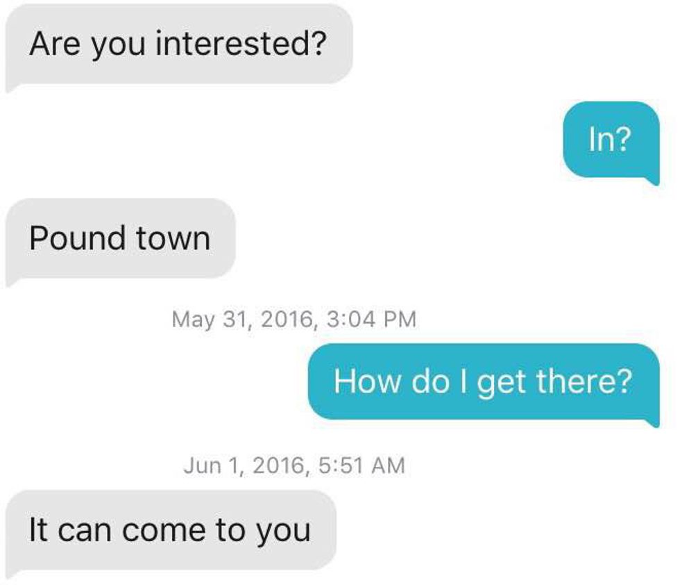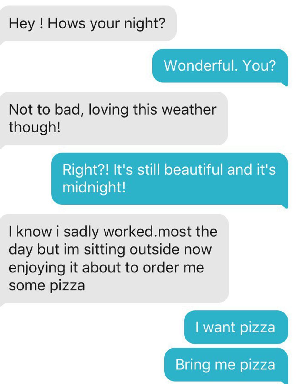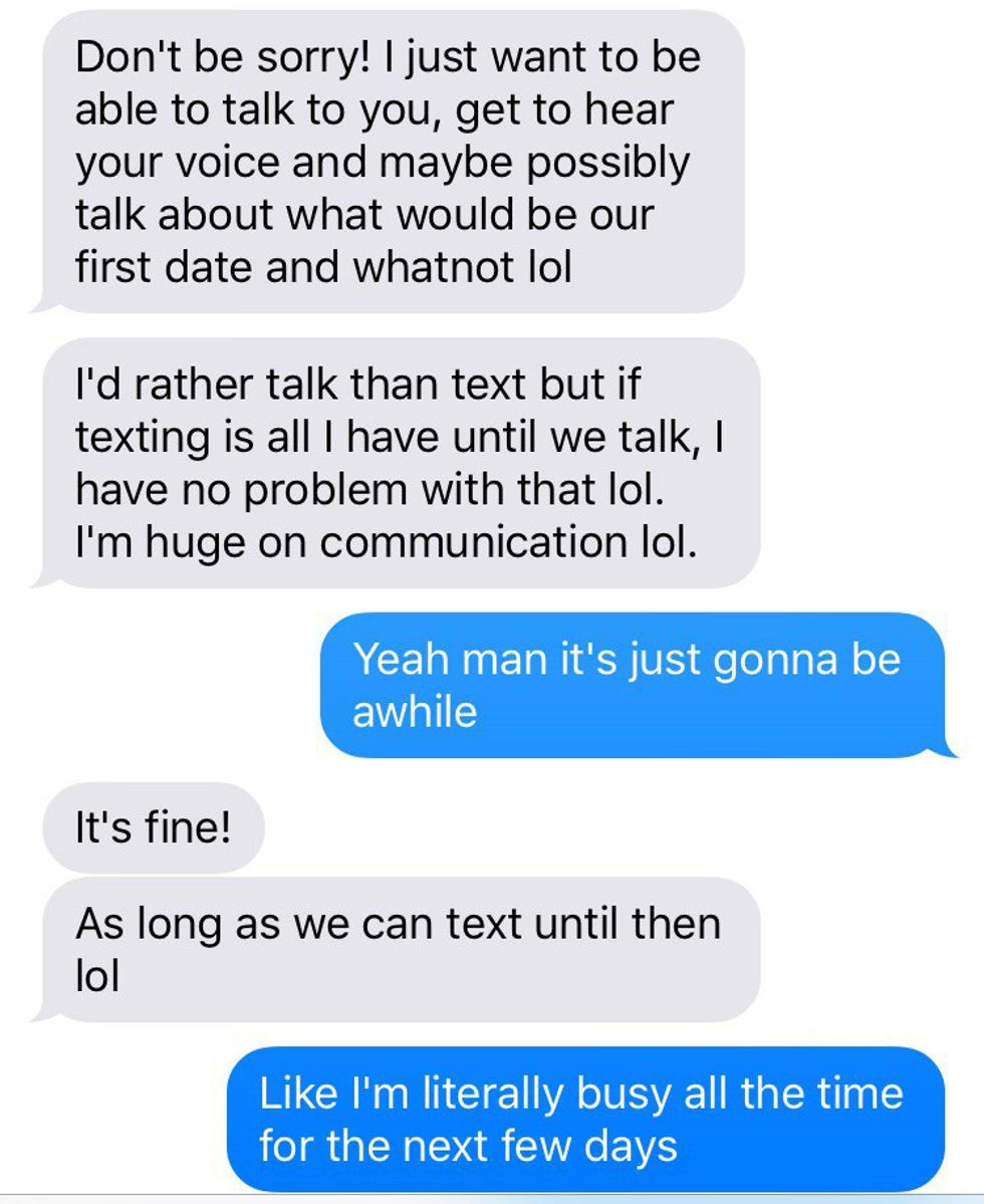 This match seems nice, and normal, so you make the mistake of giving him or her your phone number, because texting is so much easier than opening the app. On Tinder, they seemed friendly and a nice conversationalist, and now you’re getting paragraph messages every second, intermingled with pictures of sunsets and videos of them messing around on their guitar. They want to hang out, and text you repeatedly telling you how much they can’t wait to meet you in person. When you ignore them, they text again, leading with Are you mad at me? and Wanna talk on the phone?