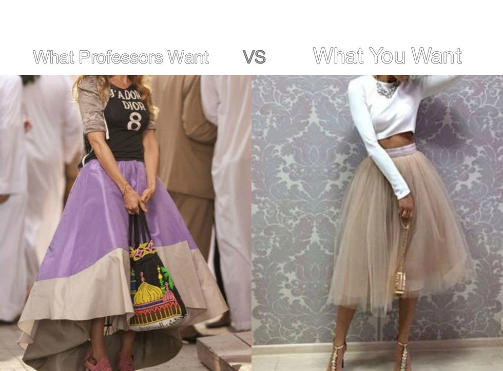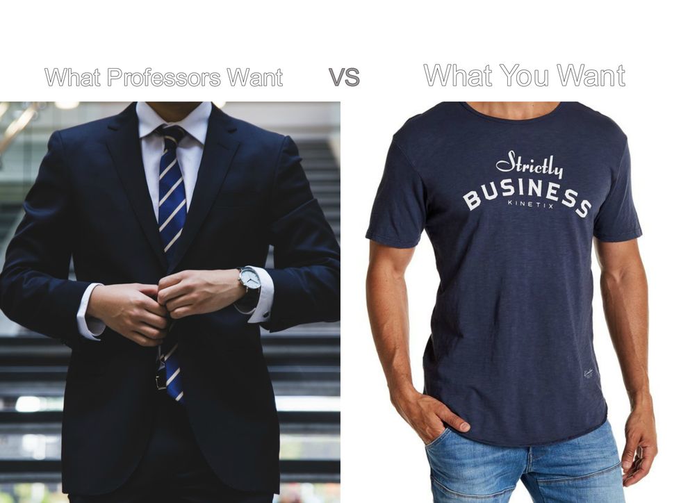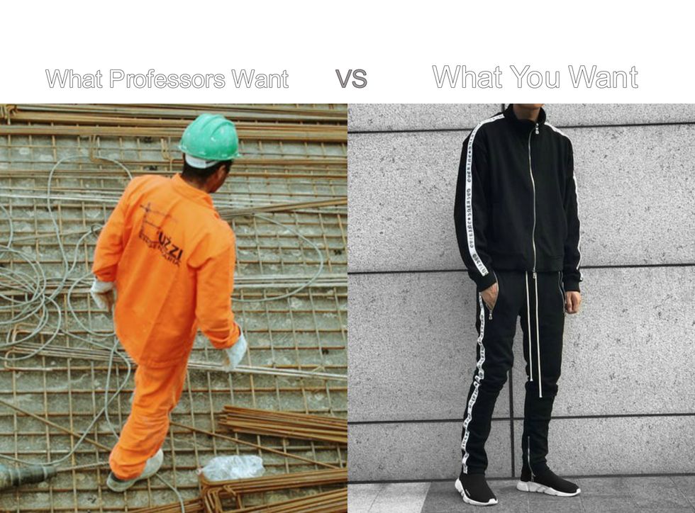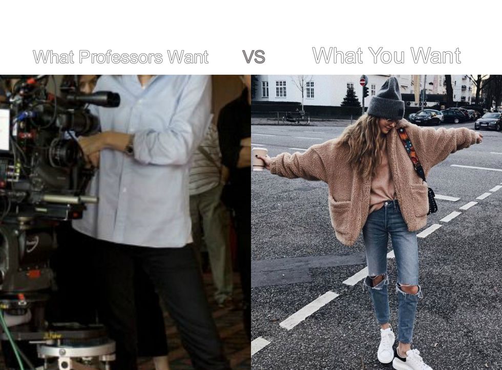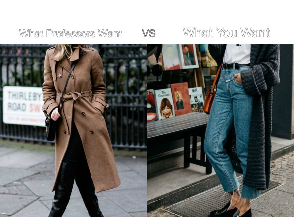 The way your professor pictures your major outfit is something you would see on the streets of Manhattan. But, you just want to wear your high-waisted Mom jeans with your knock-off Gucci loafers.