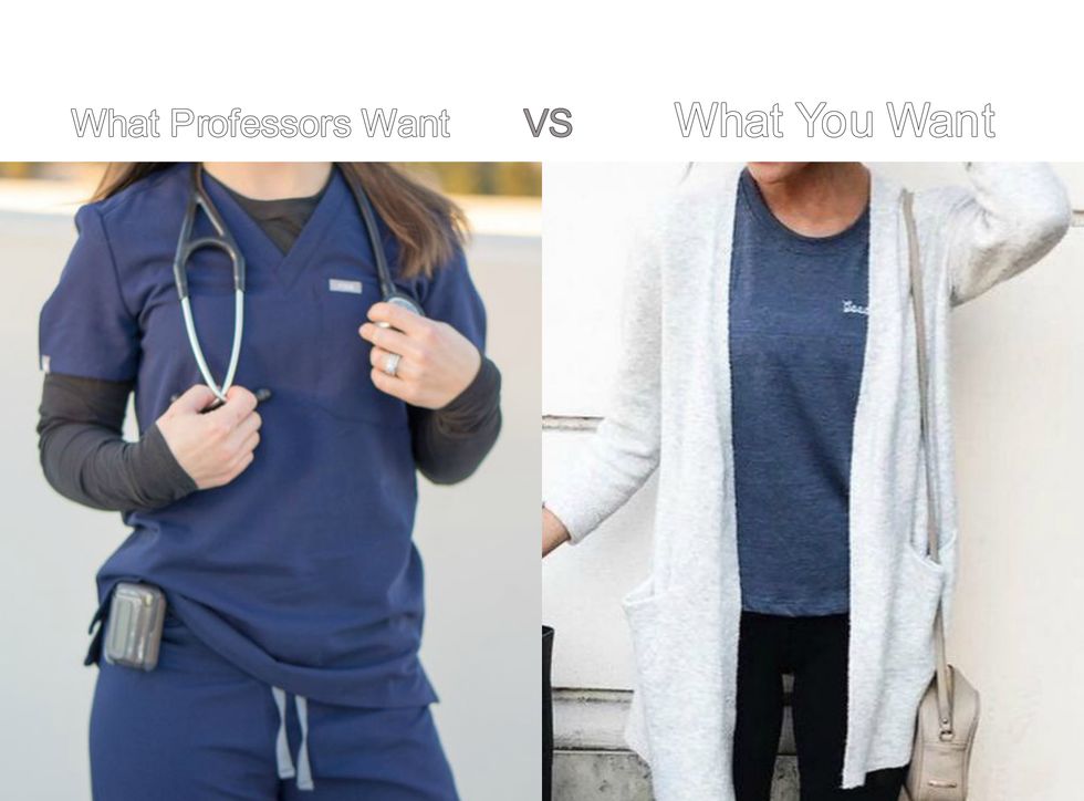 Scrubs. That's what your professor would want you to wear to class just so you can get the feel of it. You, on the other hand, would want to wear an outfit that feels like you're wearing scrubs but not wearing scrubs.