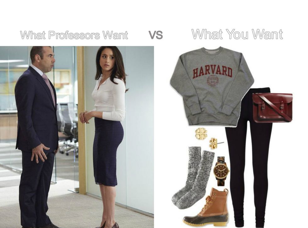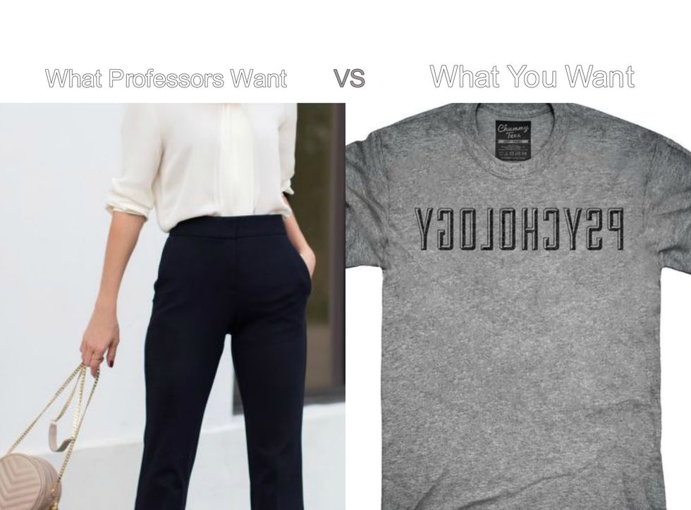 Professors definitely want you to dress the part of this major to be taken seriously. But, you just want to dress in the Ivy League university sweatshirt that you may get accepted to along with some leggings during syllabus week.