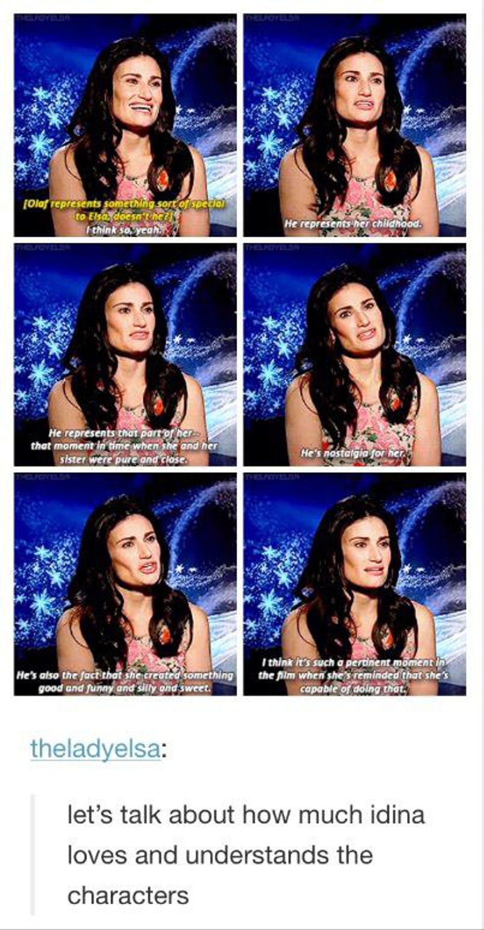 The comic relief character, Idena Menzel (Elsa's voice, for the two of you who don't know) herself has stated that Olaf represents Elsa’s childhood. He also represents Elsa and Anna’s relationship.
