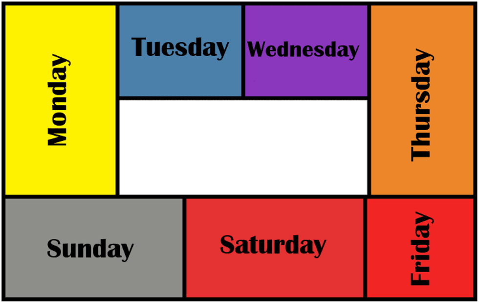 In my Bullet Journal, my days of the week are color-coded to what colors I see them as. For your viewing pleasure, here is how I view the days of the week that I made on Paint! (I promise Friday and Saturday are different colors). The shape and size of the days are an example of how I have "spatio-temporal synesthesia" AND "grapheme-color synesthesia".